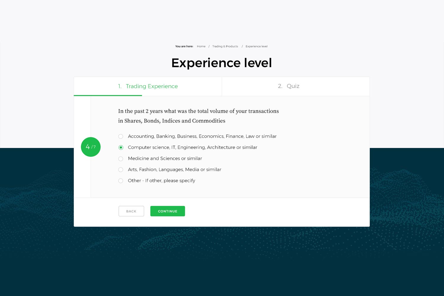 From the first screen, we offer the user two journeys: the journey of a professional trader and journey of a newcomer.