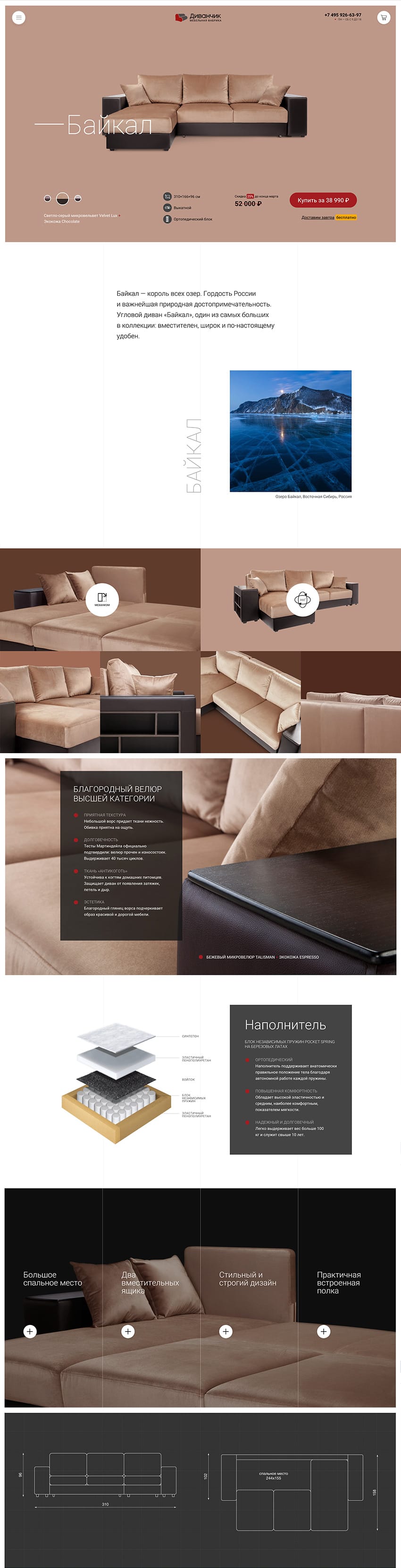 We named each model of sofa after places showing Russian nature. Each sofa has its own legend and character, which reflects its advantage and origin: Baikal, Tihiy, and Angara. There is a deep cultural context within the brand’s message “Made in Russia with love”.