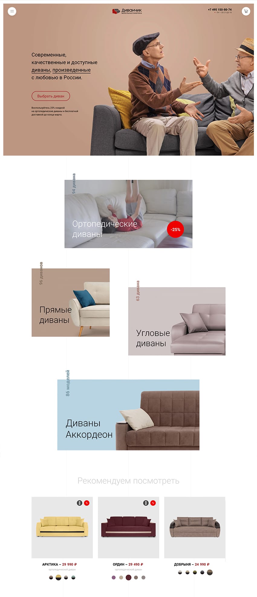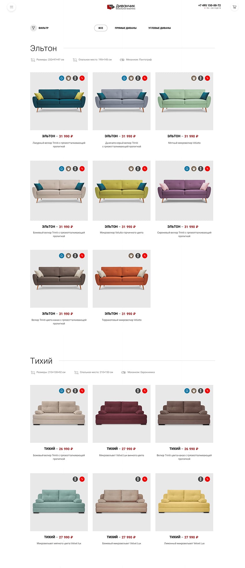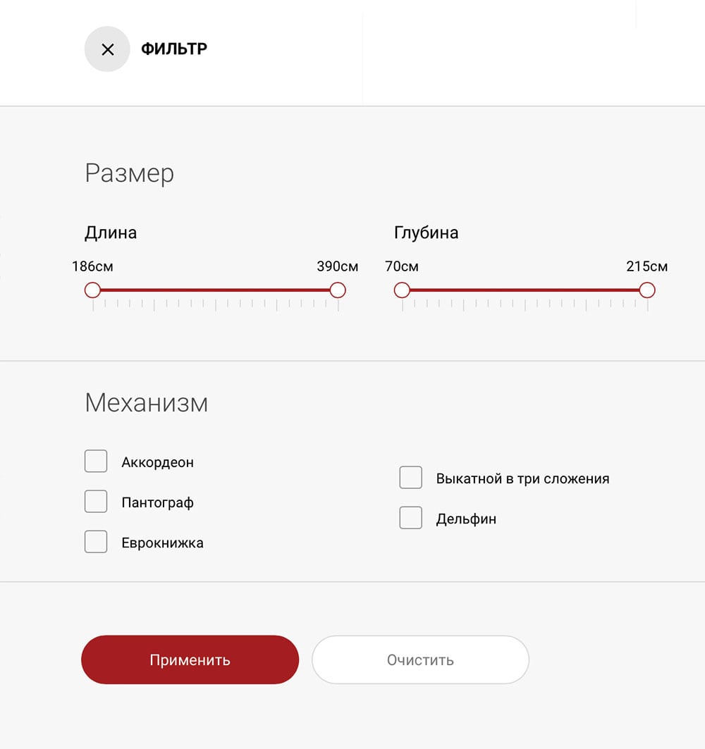 The filter allows you to choose a sofa according to its desirable characteristics and to move quickly between popular sets, like "anatomical sofas", "loft-style sofas" or even "white leather sofas".