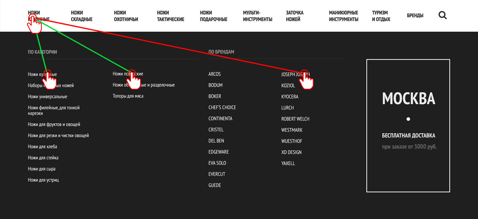 The unique mechanism of the drop-down menu gives the website an edge. As a rule, when the cursor trajectory intersects the nearest menu item, the drop-down menu shifts to another tab.