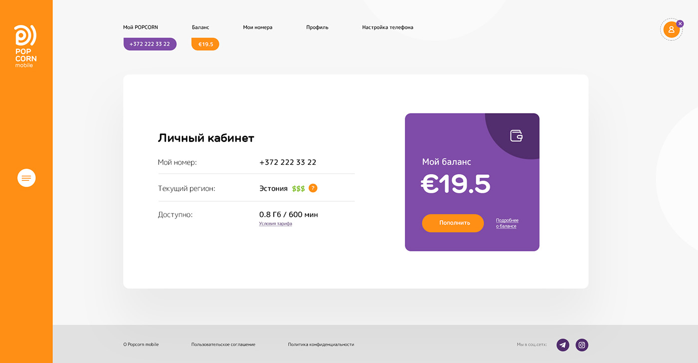 - A personal cabinet, where the customer can get details of debits and deposits, change the plan and profile details.