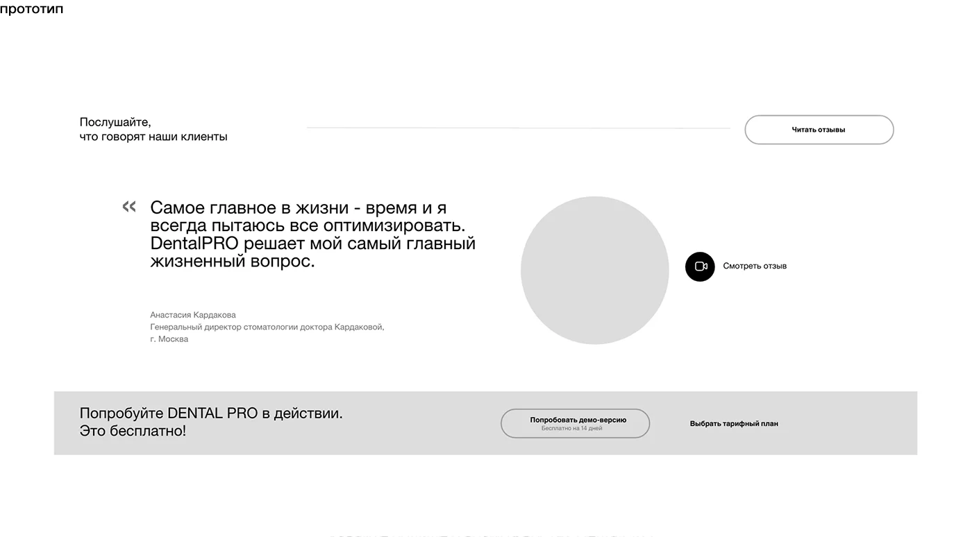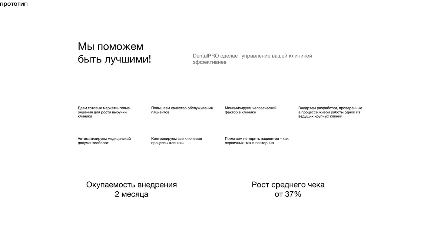 Прежний сайт не отражал ценности продукта DentalPRO, его конкурентных преимуществ продукта и не учитывал сегментацию пользователей. Клиент предоставил четкое представление о задачах и будущей структуре сайта, где предстояло подробно раскрыть: