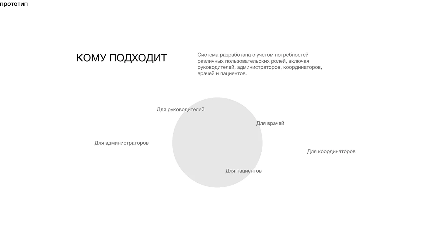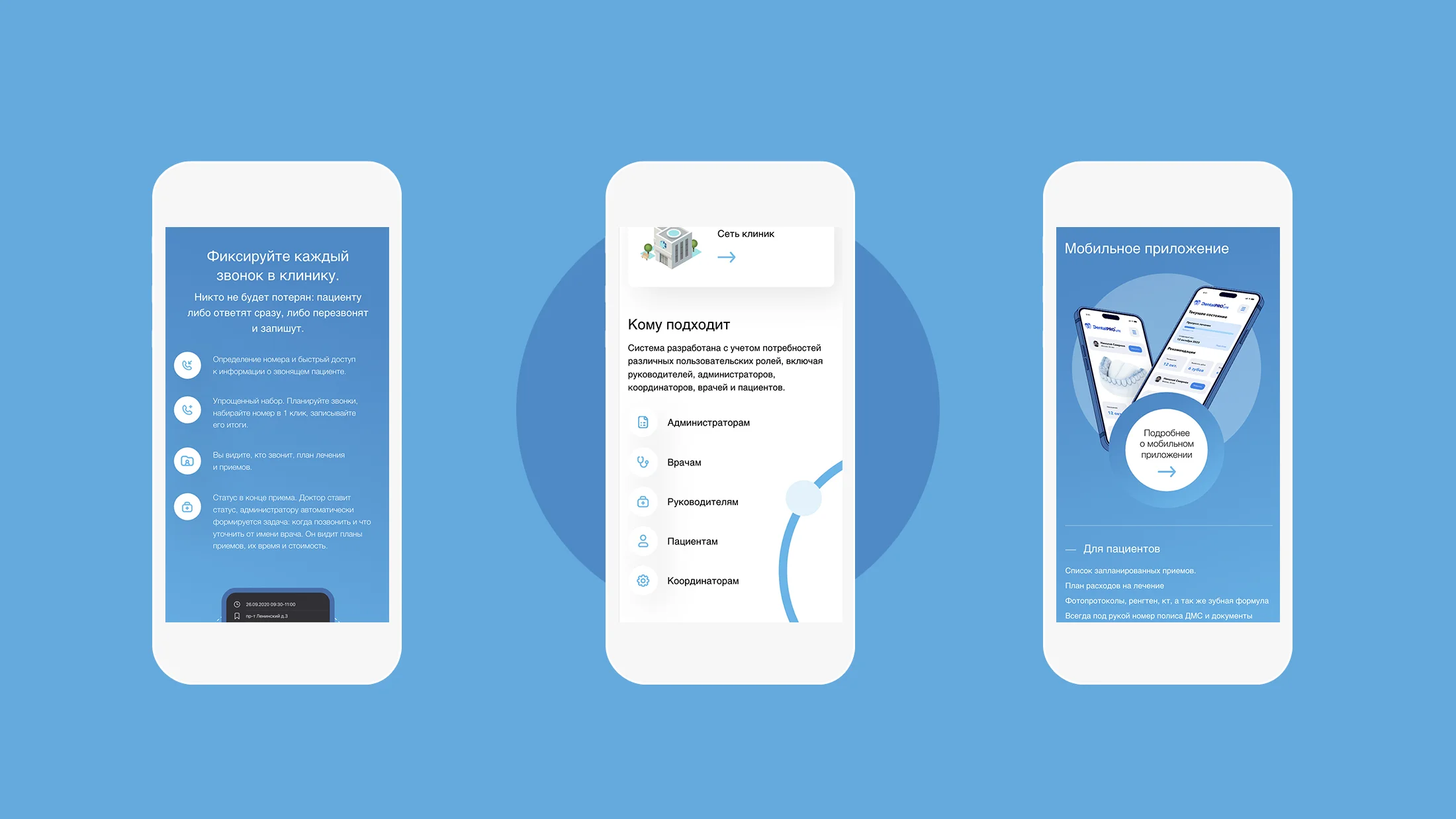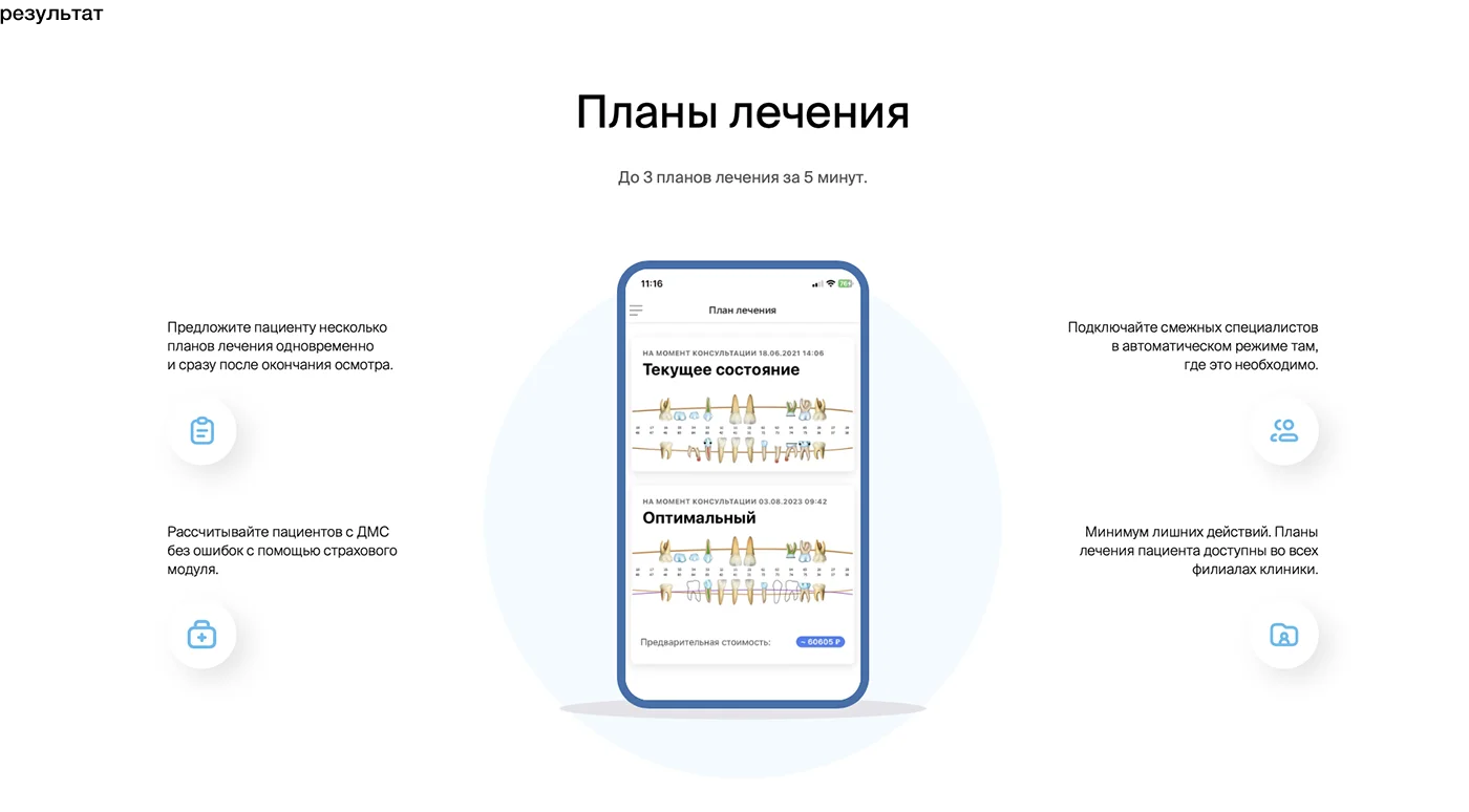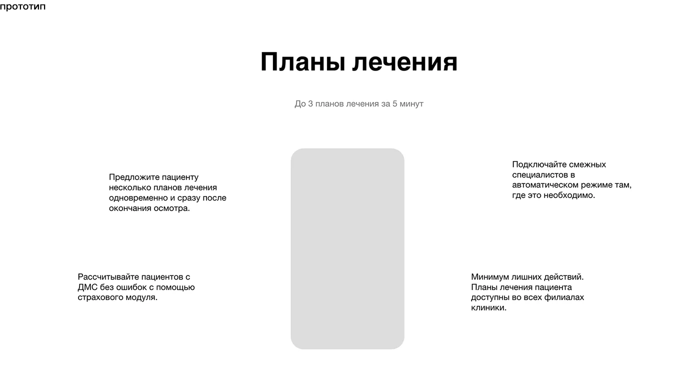 Всего реализовано 8 пользовательских сценариев и 24 лендинга функций, среди которых: электронная медицинская карта, зубная формула,