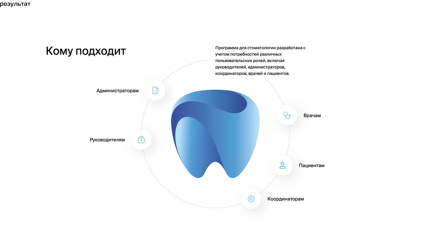 Для новых пользователей мы построили информационную архитектуру, рассказывающую, как DentalPRO помогает каждому участнику процесса:
