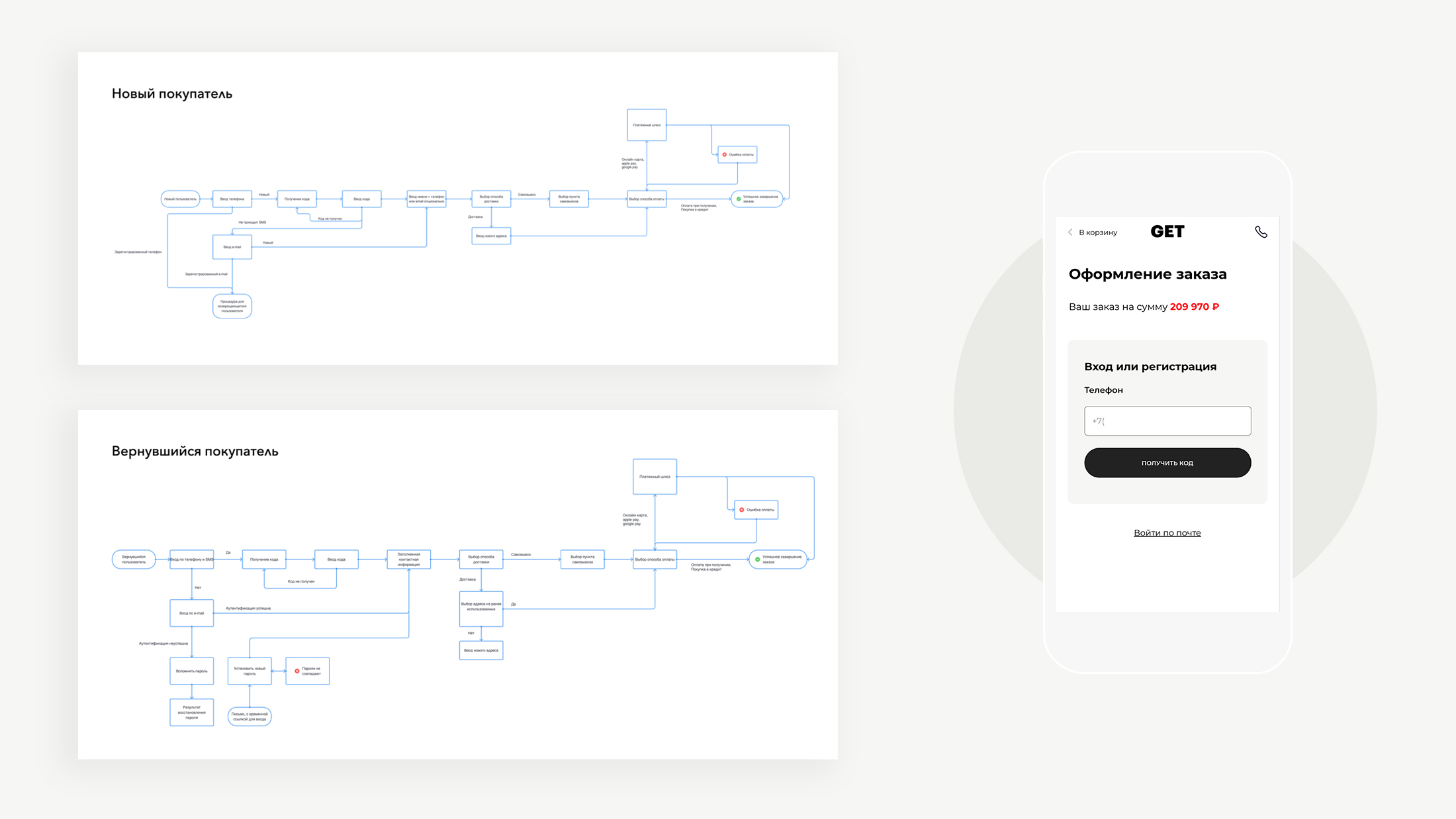 Современный покупатель ожидает, что процесс совершения покупок не вызовет затруднений. Мы провели анализ поведения пользователей в существующих проектах и болевые точки, которые затрудняют оформление заказа. Это позволило сформировать бесшовные сценарии для нового и возвращающегося покупателя с учетом деталей: