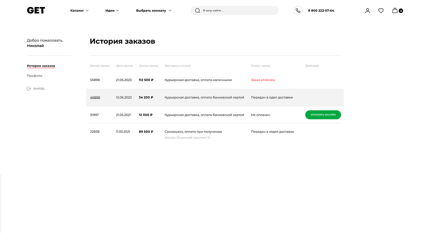 Личный кабинет пользователя построен по механизму, когда он дополняет сервисные функции. В нем можно посмотреть историю заказов, оплатить покупки, узнать состояние заказа.