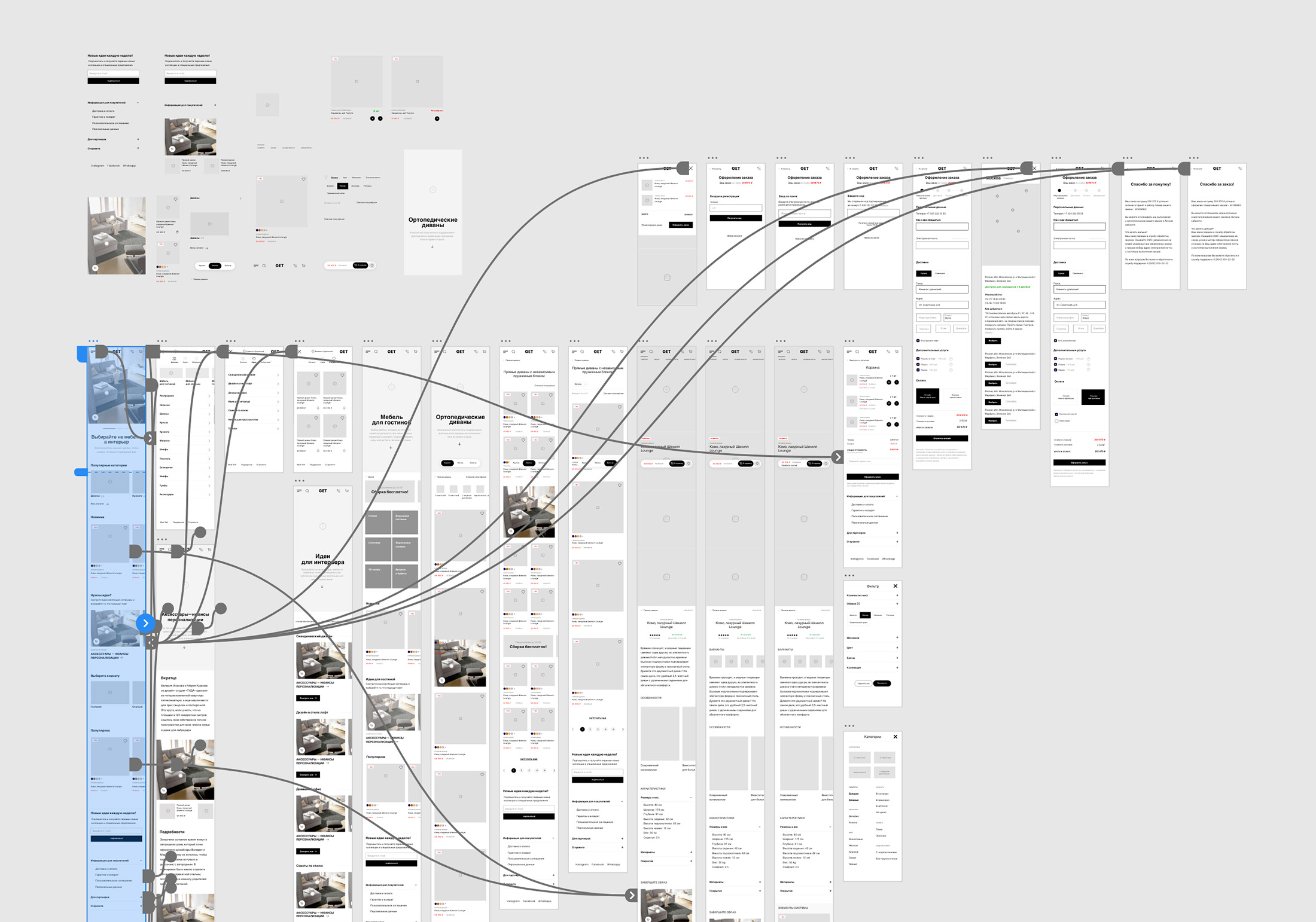 Перед тем, как приступить к UX дизайну проекта, мы сформировали карту функциональных референсов, разобрав 37 наиболее интересных мебельных сайтов, приемов навигации, представления продукта, поиска, сортировки, оформления заказа.